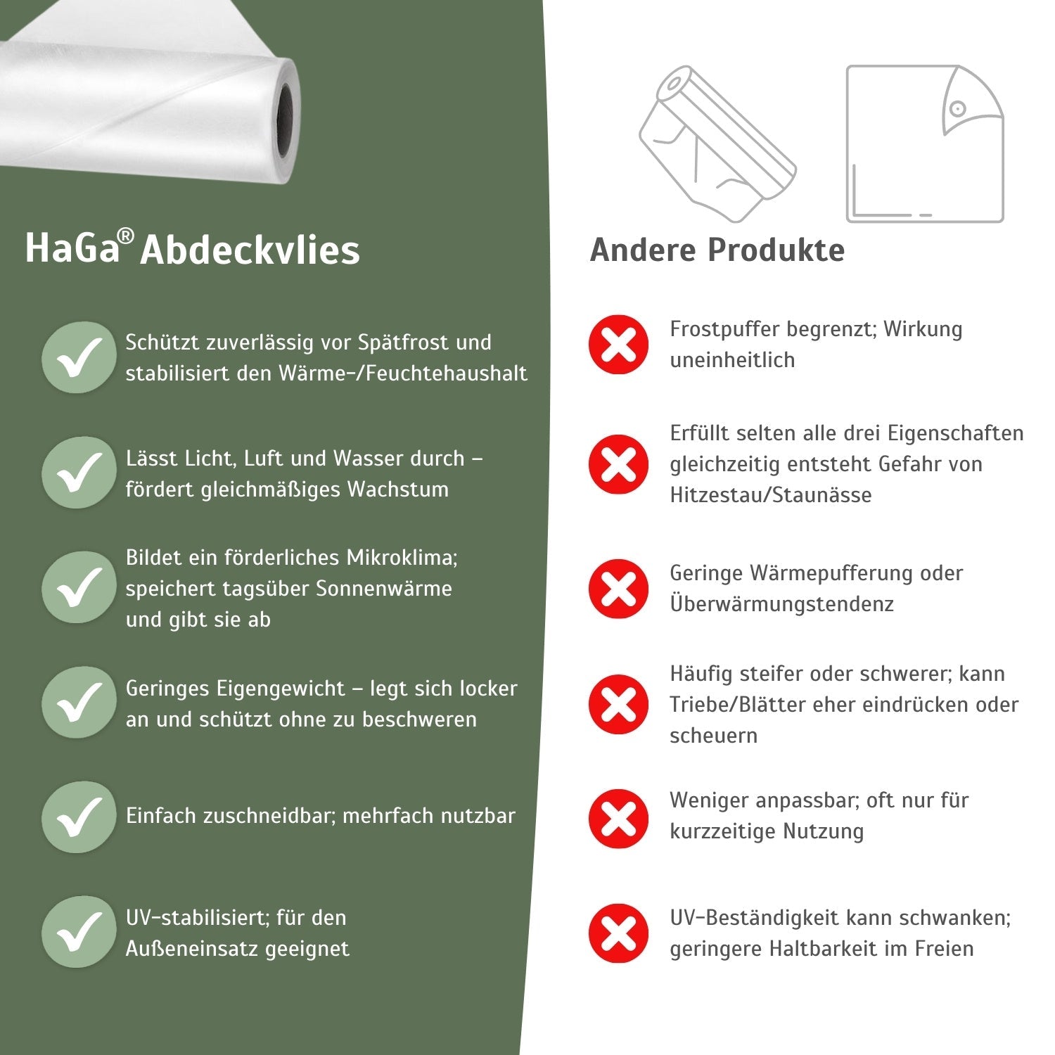 Wenn Sie auf der Suche nach einem effektiven Schutzvlies sind, das Ihre Pflanzen sicher durch die frostigen Nächte bringt, haben Sie mit dem HaGa® Erntevlies die ideale Lösung gefunden. Das Abdeckvlies verhindert, dass sich der Frost auf die Pflanzen setzen und diesen somit schaden kann. Außerdem sorgt es dafür, dass sich Wärme länger unter dem Pflanzen-Frostschutzvlies hält und so für optimale Bedingungen sorgt, die Ihre Pflanzen schneller und gesünder wachsen lassen.