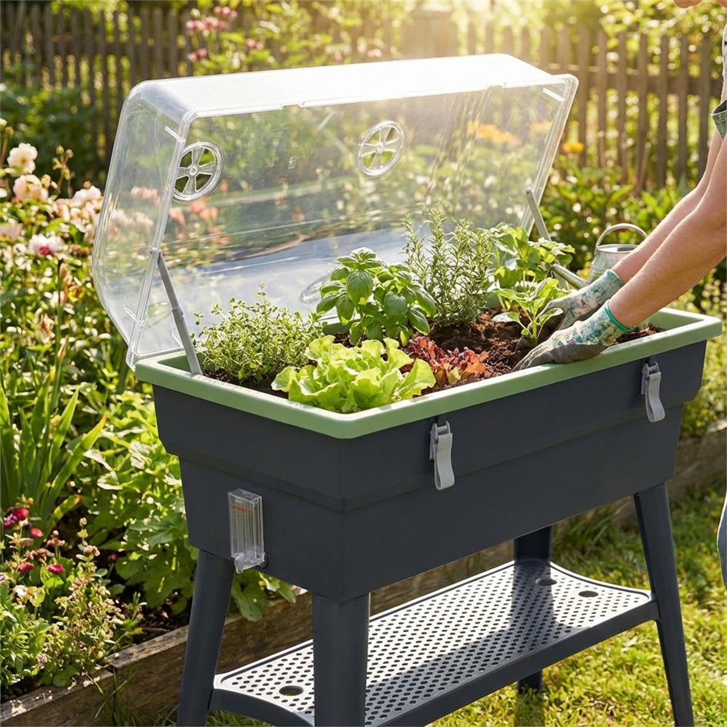 Das Hochbeet verfügt über eine Erdwanne mit 40 Litern Volumen sowie einen integrierten 7-Liter-Wassertank. Einmal befüllt, versorgt das System Ihre Pflanzen automatisch über einen längeren Zeitraum. Dank der praktischen Wasserstandsanzeige behalten Sie den Überblick.