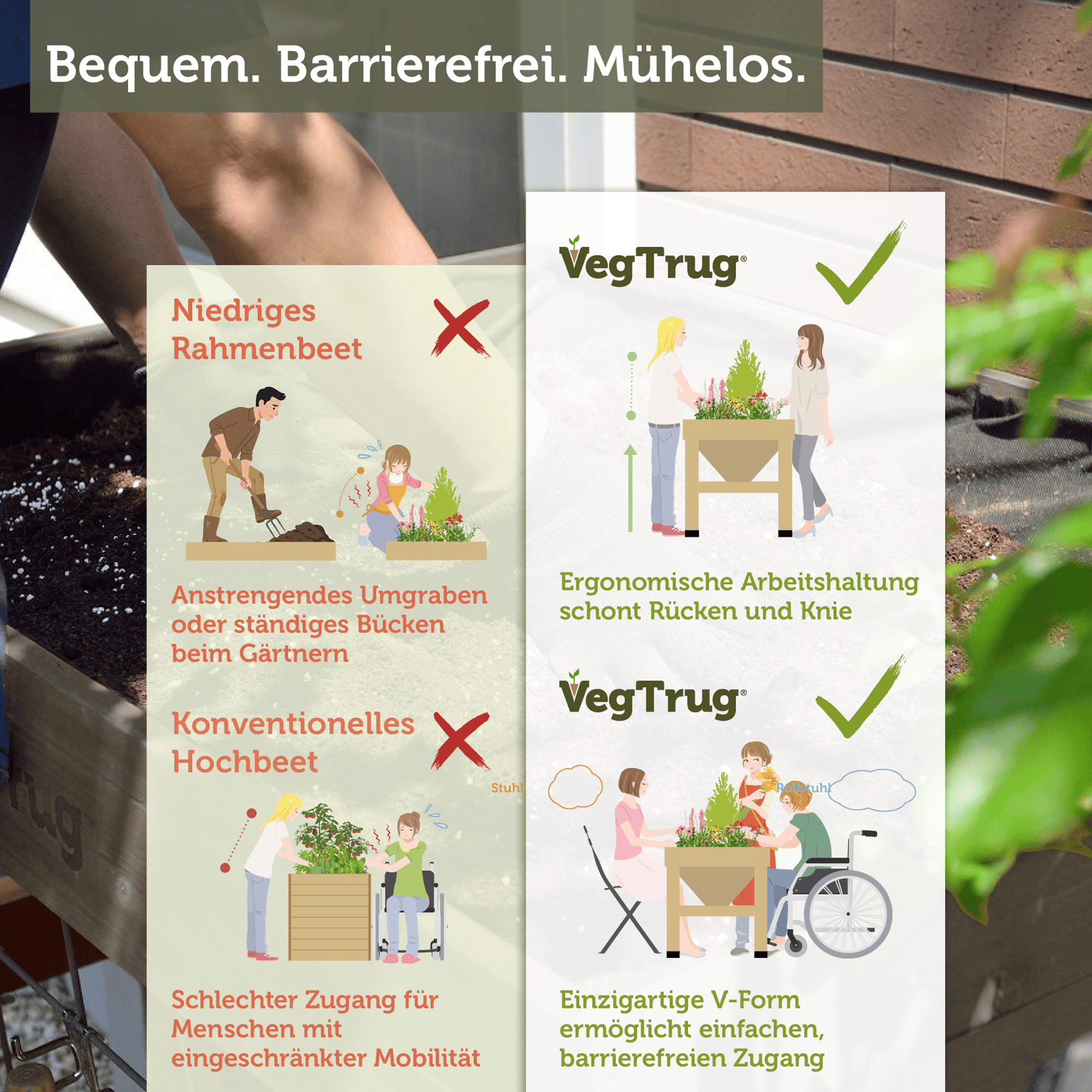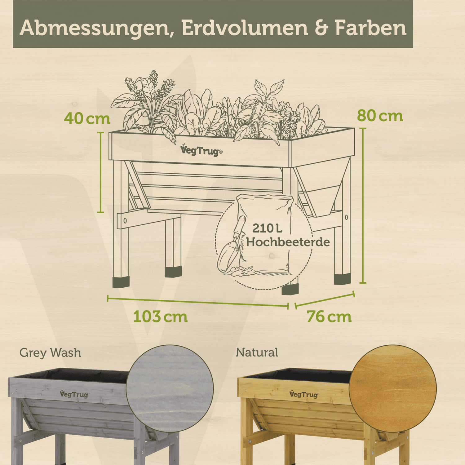 Dank der ergonomischen Arbeitshöhe ist das Hochbeet besonders knie- und rückenschonend. Auch für Rollstuhlfahrer ist das Beet leicht zugänglich. Mit einem Fassungsvermögen von ca. 210 Litern bietet das VegTrug® Hochbeet Klassik ausreichend Platz für vielfältige Pflanzprojekte.