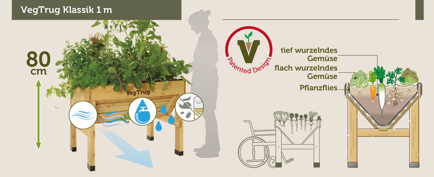 Die charakteristische V-Form des VegTrug® Hochbeets ermöglicht gleichzeitig flaches und tiefes Wurzelwachstum. Dadurch können unterschiedliche Pflanzenarten optimal gedeihen. Der mitgelieferte biologisch abbaubare Pflanzvlies sorgt für eine gute Durchlüftung der Wurzeln und eine effektive Drainage.