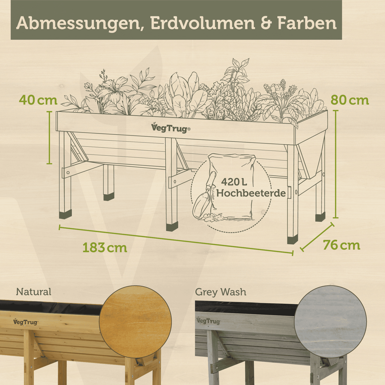 Die ergonomische Arbeitshöhe schont Rücken und Knie und ermöglicht ein komfortables Gärtnern im Stehen. Auch für Rollstuhlfahrer ist das Hochbeet leicht zugänglich. Das VegTrug® Hochbeet Klassik 1,8 m ist in den Farbvarianten Natur und Greywash erhältlich und fügt sich harmonisch in unterschiedliche Garten- und Wohnkonzepte ein.
