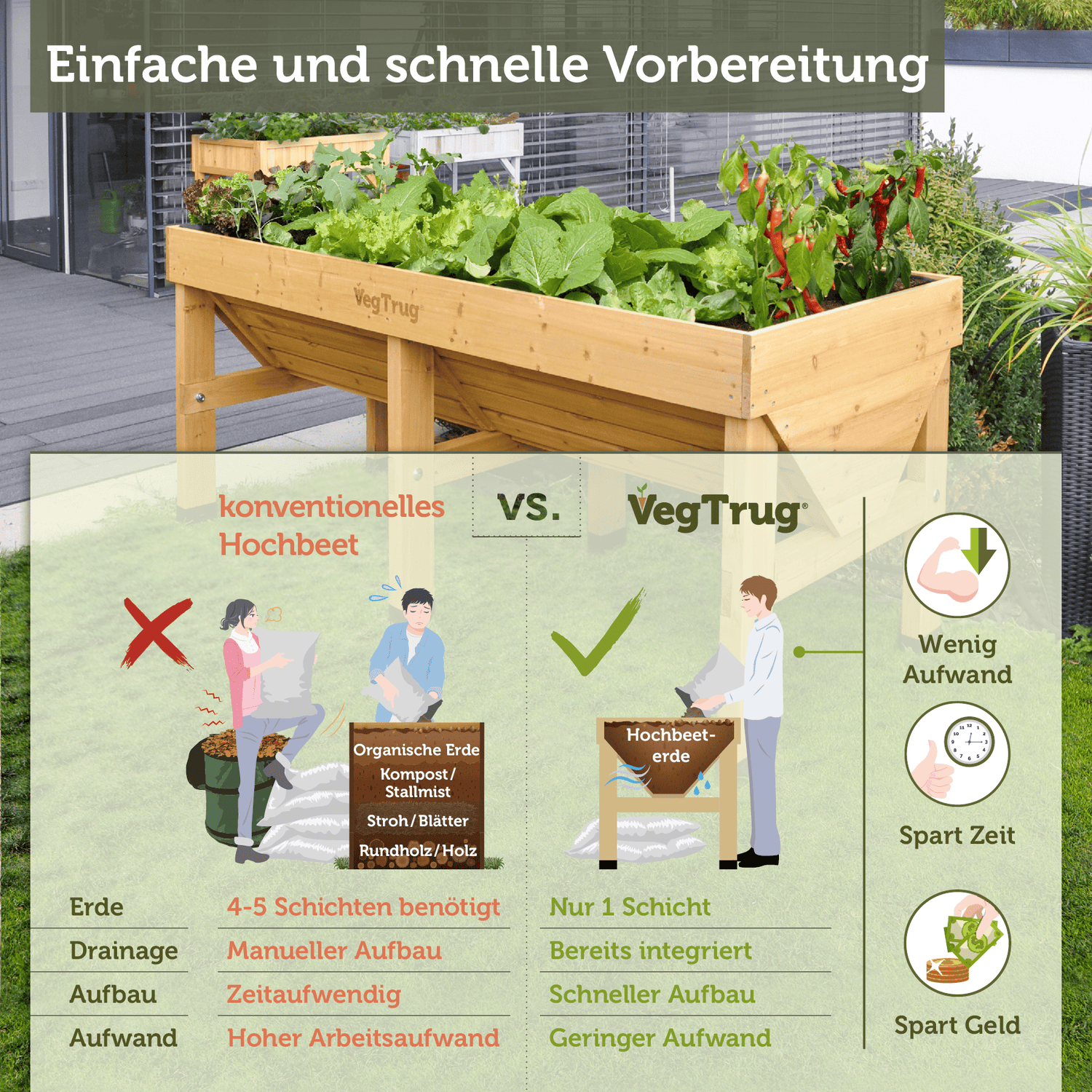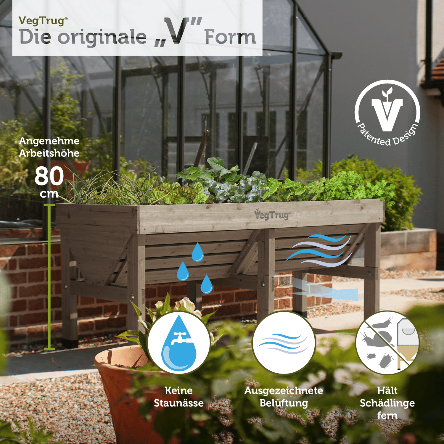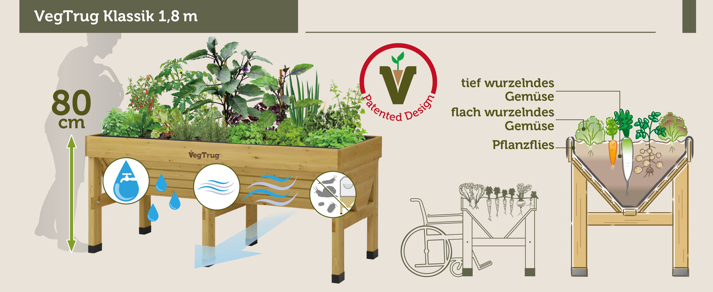 Die charakteristische V-Form des VegTrug® Klassik ermöglicht gleichzeitig flaches und tiefes Wurzelwachstum. Dadurch können unterschiedlichste Pflanzenarten – von Salaten über Kräuter bis hin zu tief wurzelndem Gemüse – optimal kultiviert werden. Mit einem Fassungsvermögen von ca. 420 Litern bietet das Hochbeet ausreichend Platz für vielfältige Bepflanzungen.