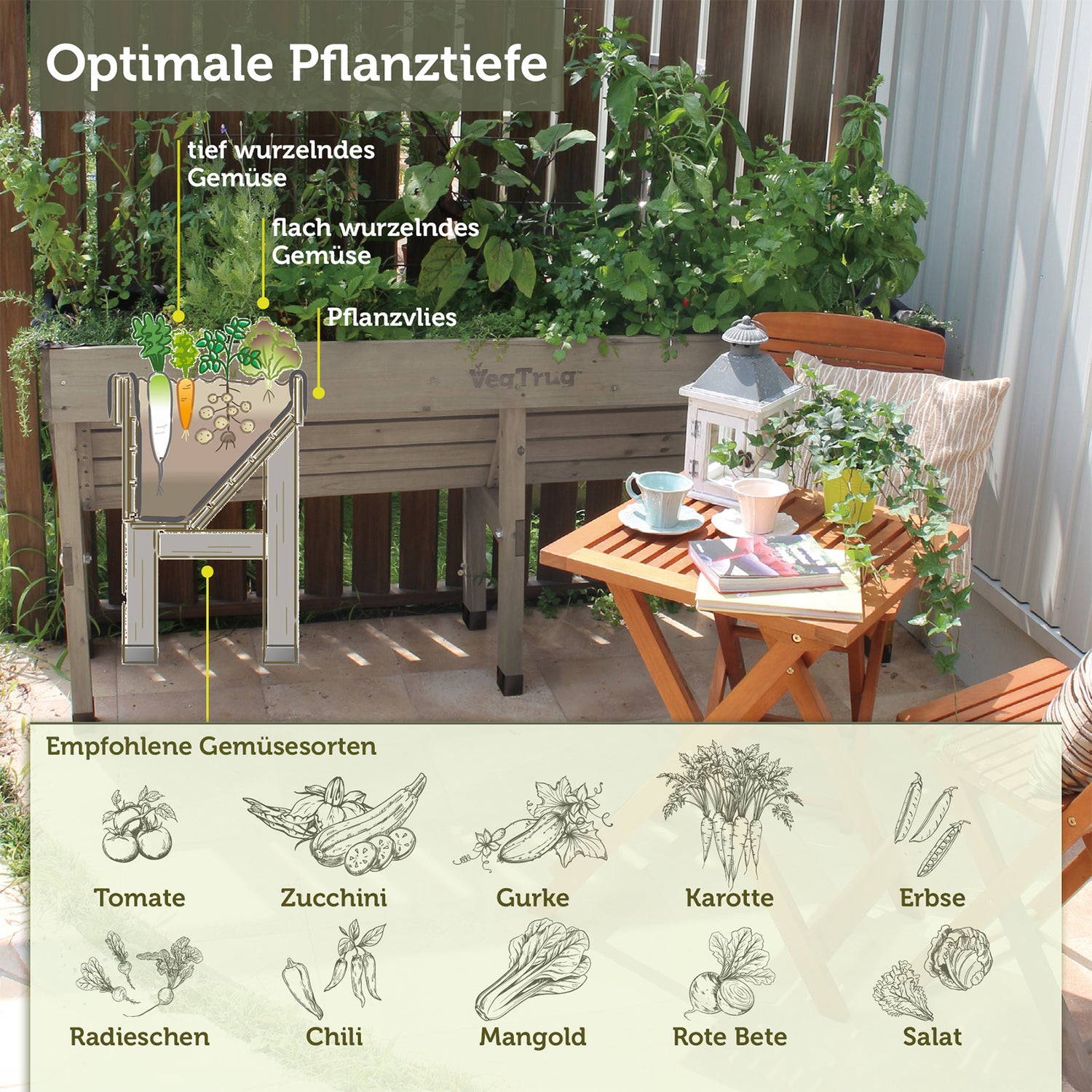 Die ergonomische V-Form des VegTrug® WallHugger ermöglicht gleichzeitig flaches und tiefes Wurzelwachstum. Dadurch können unterschiedlichste Pflanzenarten – von Kräutern und Salaten bis hin zu tief wurzelndem Gemüse – optimal kultiviert werden. Der mitgelieferte, vorgeformte und biologisch abbaubare Pflanzvlies sorgt für eine gute Durchlüftung der Wurzeln und eine zuverlässige Drainage.