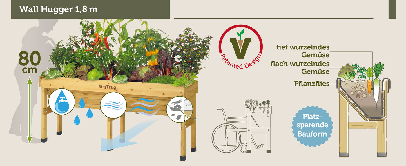 Dank der angenehmen Arbeitshöhe ist das Hochbeet besonders rücken- und knieschonend. Auch für Rollstuhlfahrer ist der VegTrug® WallHugger leicht zugänglich. Durch seine schlanke Bauweise kann das Hochbeet direkt vor Wänden oder Zäunen platziert werden und eignet sich damit hervorragend für vertikal orientierte Gartenkonzepte.